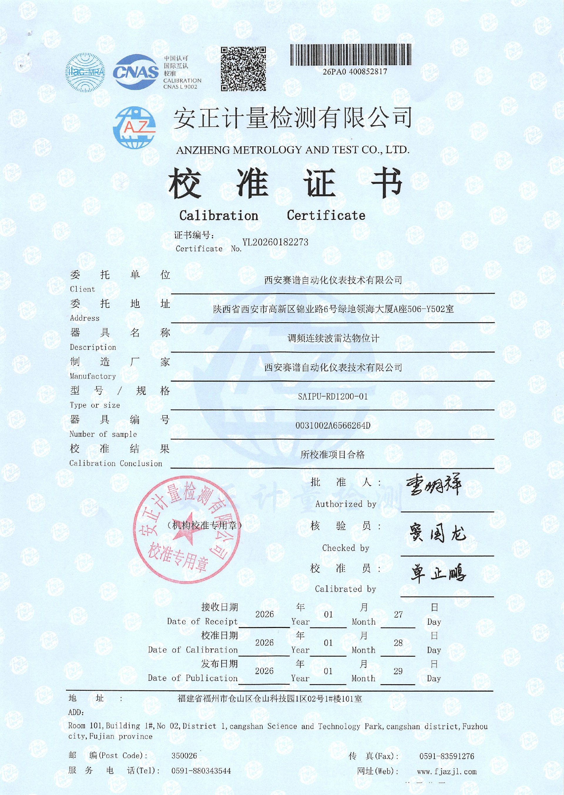 120ghz线性雷达液位计校准报告SAIPU-RD1200-01